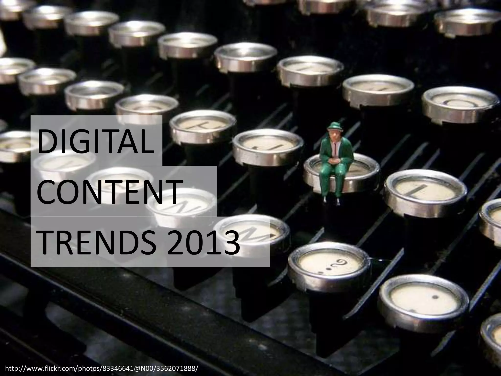 The document discusses several digital content trends in 2013, including the changing dynamics of paid, owned, and earned media. It also covers the spread of curation across professional, social, and algorithmic approaches. Another section discusses the rise of subcompact publishing and how companies like Google, Apple, Facebook, and Amazon are expanding their presence across different areas through their vertical stacks. The document concludes with brief discussions on humans and robots, big data, and how data is being used with content.