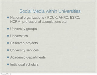 The document discusses the emerging use of digital technologies and social media within higher education. It explores how universities are using platforms like social media to enhance their reputation and engage with current and former students. While adoption of these tools is still low among researchers, younger doctoral students are more open to using technologies that can aid their work, like social media for collaboration. The document also examines how academics are using blogs for different purposes, from documenting their research journey to communicating ideas and debates. It reflects on tensions around marketing versus research-driven uses of these platforms and changing definitions of scholarly "publishing".