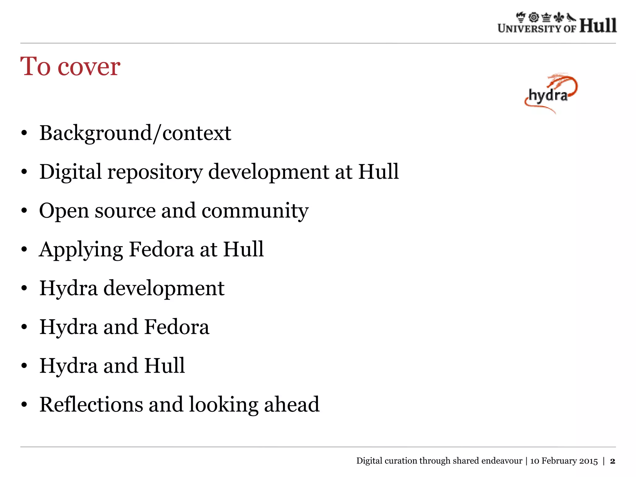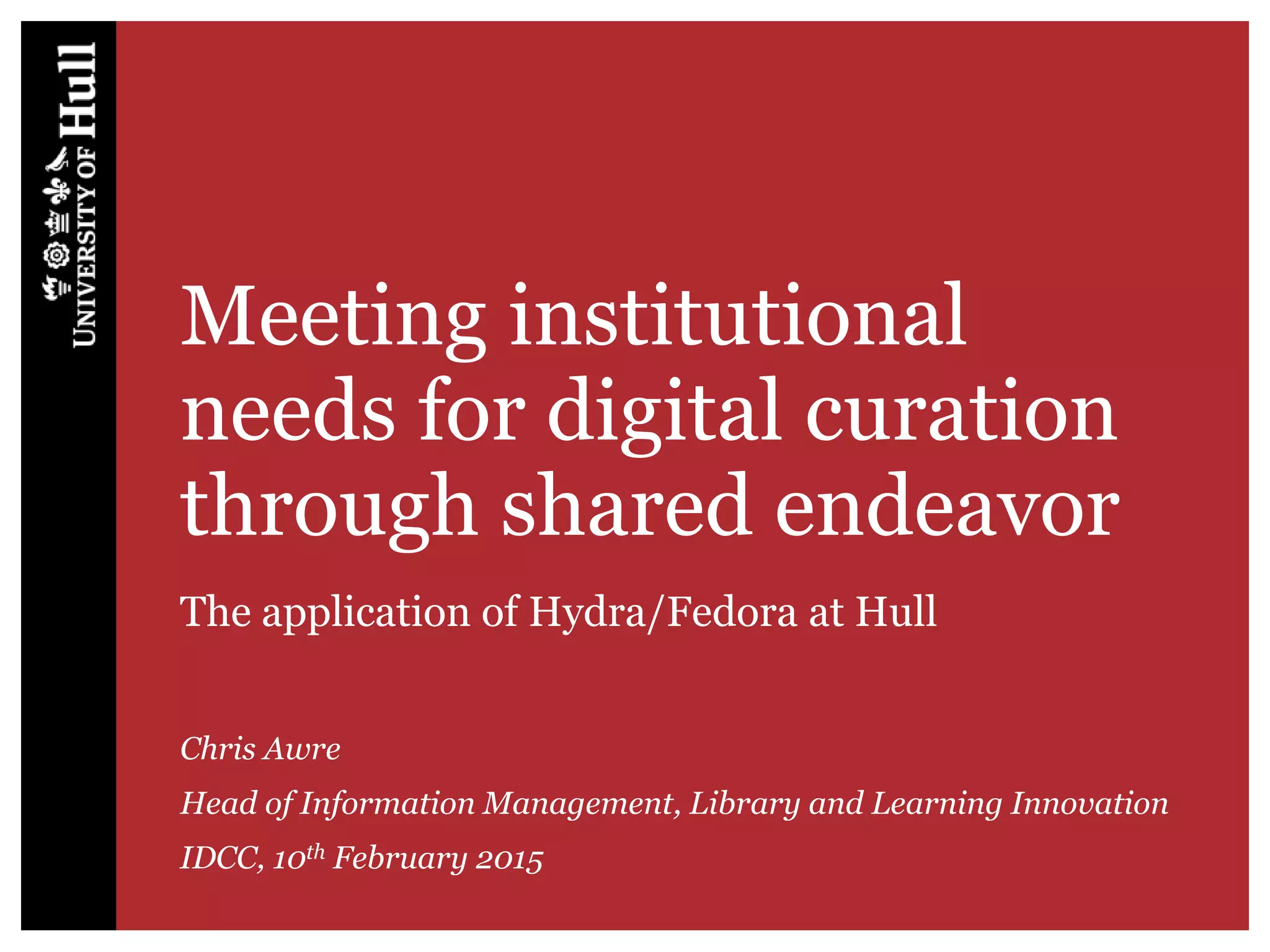 The document discusses the implementation of digital curation strategies at the University of Hull using the Fedora and Hydra systems, detailing the background, key principles, and collaborative efforts. It highlights the importance of a scalable, content-agnostic repository that facilitates diverse uses and integrates with existing systems to minimize resource strain. Future directions include enhancing cohesion among Hydra initiatives and adapting to new digital curation needs.