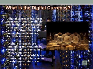 Digital currency exists solely in electronic form and includes cryptocurrencies, which use cryptography for security and are largely decentralized. Bitcoin, the first cryptocurrency, offers promise for direct transactions without third parties, but it faces challenges like slow transaction speeds and high energy consumption for mining. The future of Bitcoin and other cryptocurrencies remains uncertain, with potential for value fluctuation and increasing acceptance among companies as a payment method.