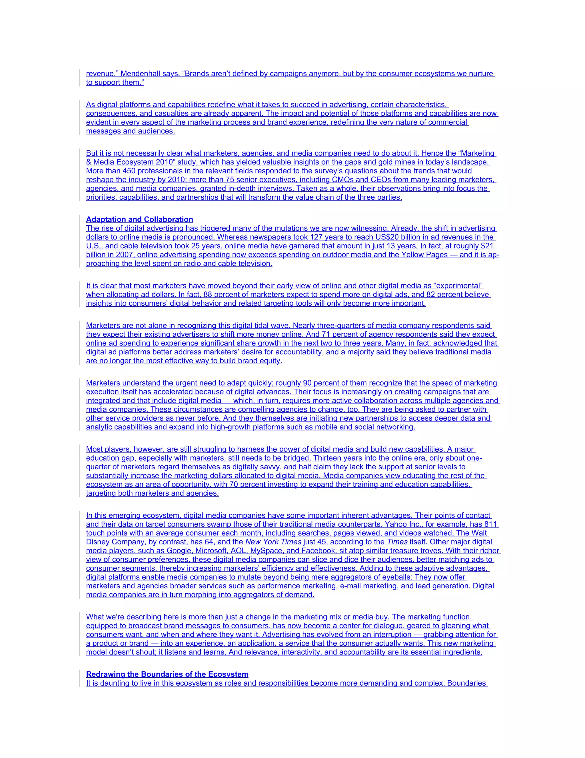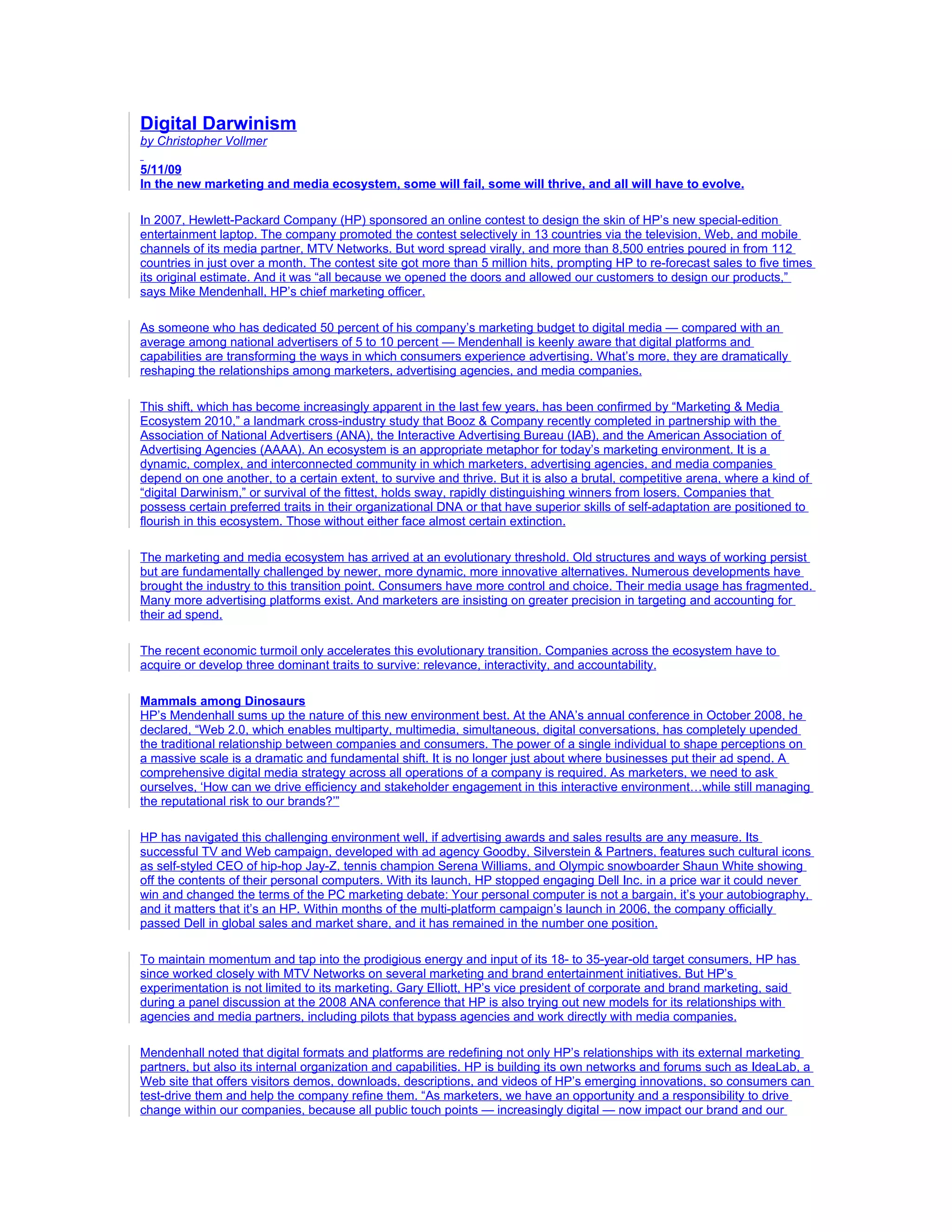 The document explores the evolution of marketing in a digital ecosystem, highlighting HP's successful strategies, particularly its consumer-driven design contests that significantly boosted sales. It emphasizes the importance of relevance, interactivity, and accountability for businesses to thrive amid digital Darwinism, where only the adaptable survive. The insights from the 'Marketing & Media Ecosystem 2010' study underscore the need for collaboration between marketers, agencies, and media companies in a rapidly changing advertising landscape.