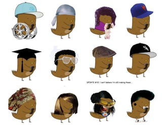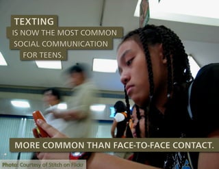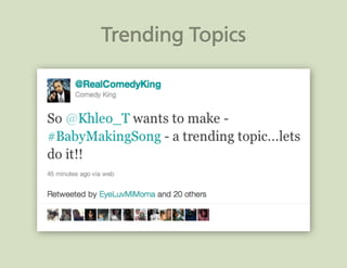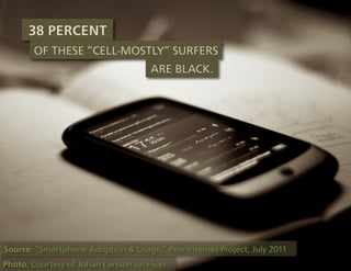 This document contains multiple charts and graphs from various studies about media usage trends over time. It shows that time spent watching TV and listening to music has decreased for youth since 1999, while time spent playing video games and using computers has increased. It also shows differences in media usage among ethnic groups. Additional charts show increasing mobile phone and smartphone adoption over time, especially for social networking, photos and videos. The document advocates using hashtags to organize tweets and streaming tweets over music videos to engage audiences.