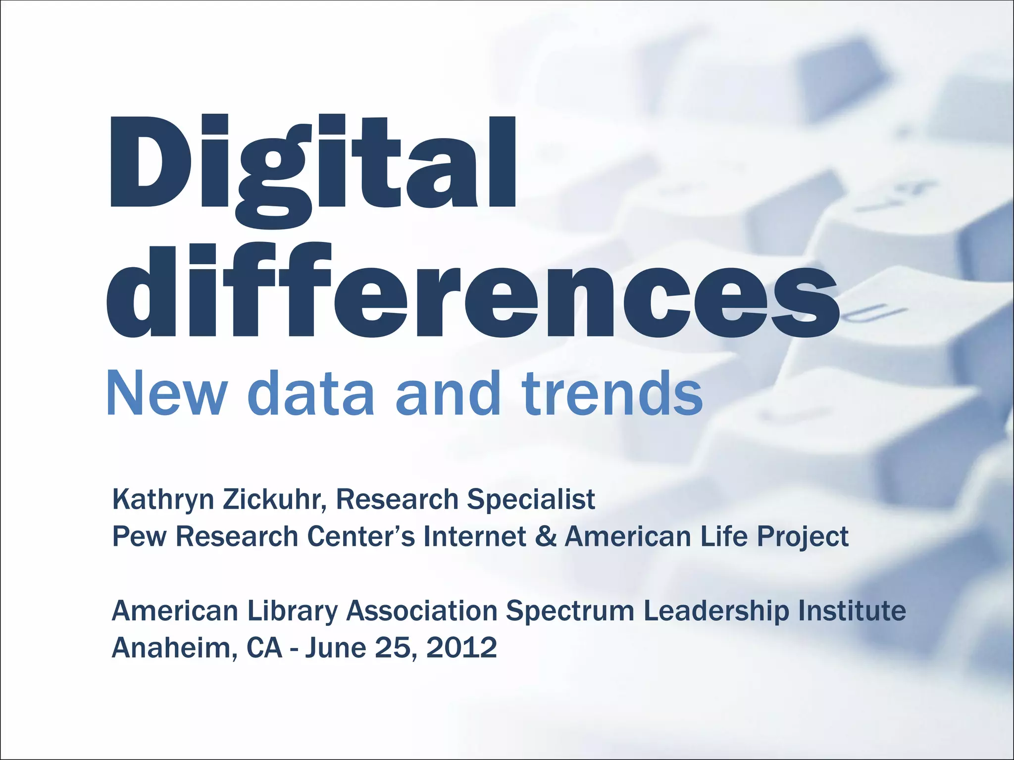 This document summarizes a presentation given by Kathryn Zickuhr of the Pew Research Center's Internet & American Life Project. The presentation discusses trends in digital technology use among Americans, including growth in internet access and smartphone/tablet ownership over time. It also examines differences in technology adoption and activities across age, income, education and racial/ethnic groups. Key findings include that 82% of American adults now go online, 66% have home broadband, and about half own smartphones. Tablet and e-reader ownership has also grown substantially in recent years.