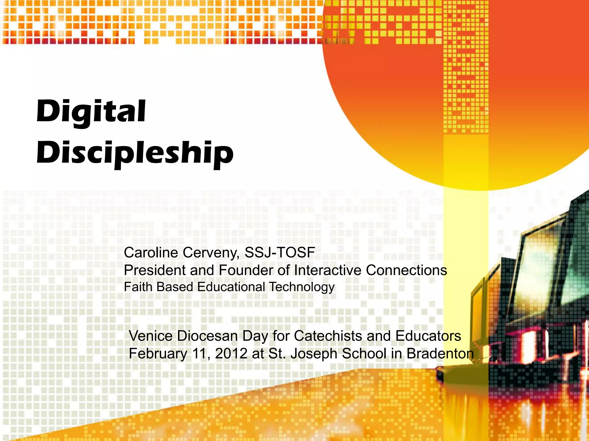 Caroline Cerveny, president of Interactive Connections, discusses the concept of digital discipleship at the Venice Diocesan Day for Catechists and Educators. A digital disciple is characterized by their willingness to embrace modern technology for ministry and catechesis, utilizing tools like social media while maintaining necessary boundaries. The document outlines ten actionable points for becoming a digital disciple, emphasizing collaboration, advocacy for technology in religious education, and continuous learning about media literacy.