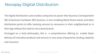 Novopay's digital distribution solution allows businesses to provide banking services through retail stores and applications without visiting bank branches. It features a comprehensive platform that includes agent management, payment processing, and analytics, enabling enhanced customer experiences across various financial services. The solution adopts a SaaS model and promotes compliance while supporting innovations in payments, lending, and insurance.