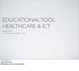 The document is a presentation on developing an educational tool to address cyberbullying and the digital divide. It discusses how [1] cyberbullying negatively impacts teenage mental health, [2] parents may be unable to support children dealing with online bullying, and [3] an interactive virtual reality experience using goggles could help bullies understand the experience of their targets and raise awareness. The tool would target 13-14 year olds and be used in schools and at parent-teacher meetings.