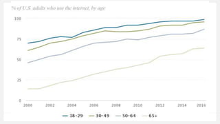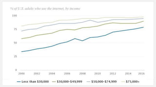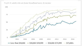 The document discusses the digital divide in the United States, highlighting disparities in internet and smartphone access based on household income, educational attainment, race and ethnicity, age, and community type. Data from Pew Research indicates that wealthier and more educated individuals have higher rates of broadband and smartphone access. Additionally, it notes a trend towards smartphone dependency, especially among certain demographics.