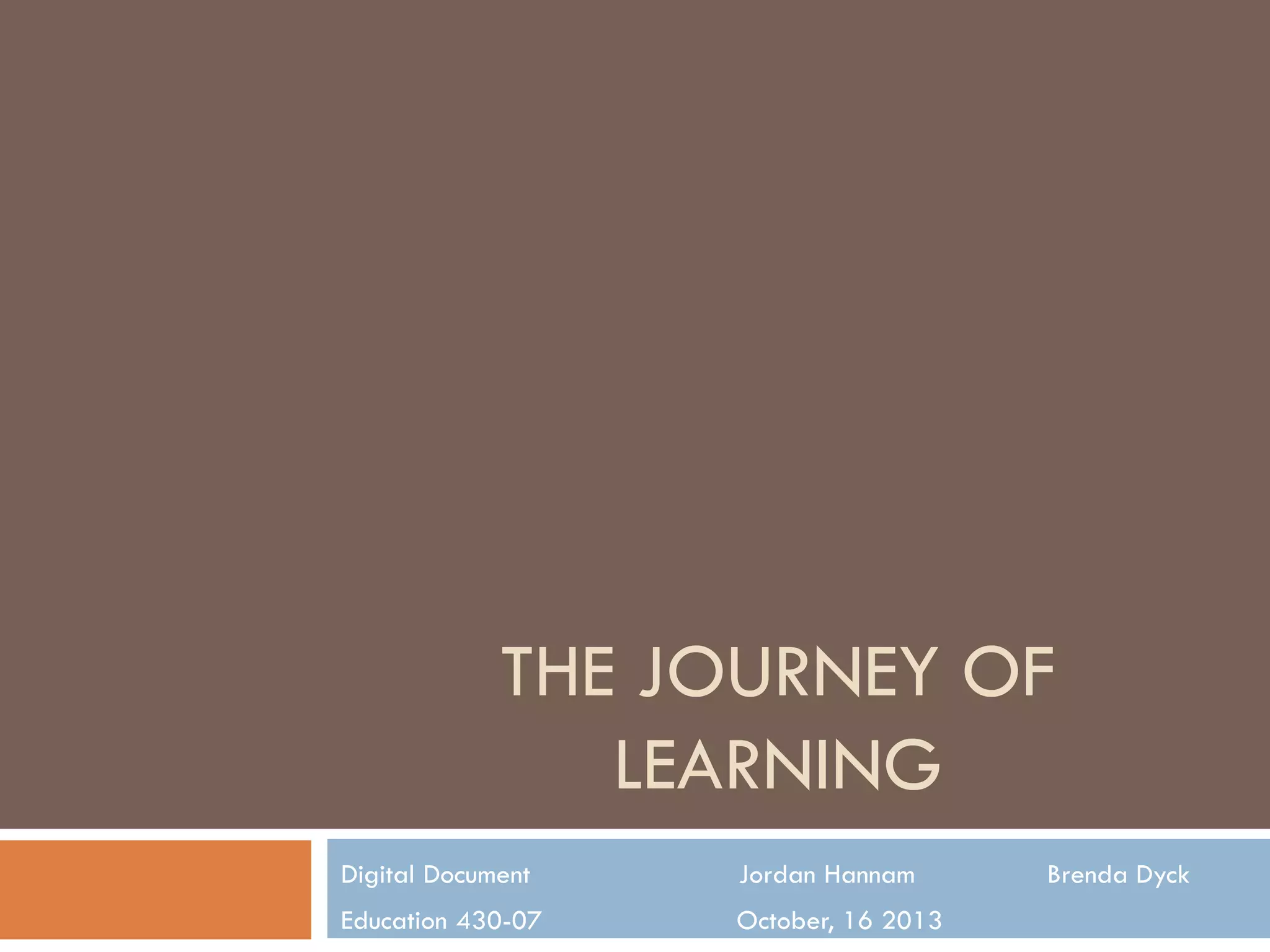This document discusses Jordan Hannam's journey of learning, including the important support systems that helped her along the way. It describes her group of friends from kindergarten through high school, her family who supported her decisions and helped overcome obstacles, and learning languages like French and Spanish alongside her sister. Examples are given of worksheets completed with her mother in grade 7, and images that sparked curiosity in her grade 7 Spanish classroom. Quotes that inspired her teaching philosophy are presented, as well as photos from her travels that she wants to inspire students with.