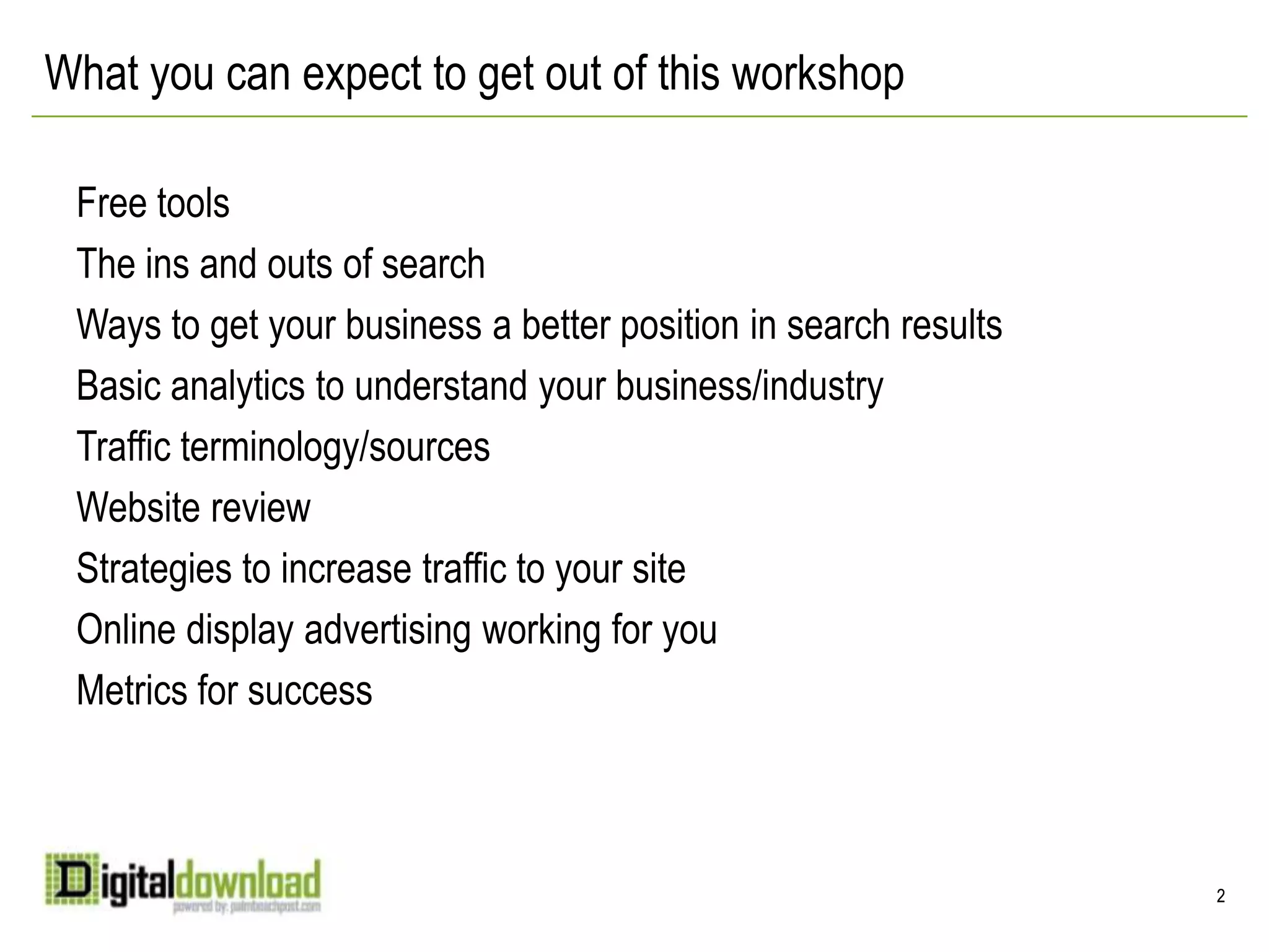 This document provides an overview of a workshop on maximizing digital marketing efforts. The workshop covers topics like search engine optimization, analyzing website traffic, online advertising, and collaborative marketing strategies. Attendees can expect to learn about free SEO tools, best practices for search and website structure, claiming their business on directories, using analytics to understand traffic, the anatomy of search engine results pages, and metrics for evaluating online advertising. The goal is to provide strategies to increase traffic and engage customers across different digital channels in an integrated way.