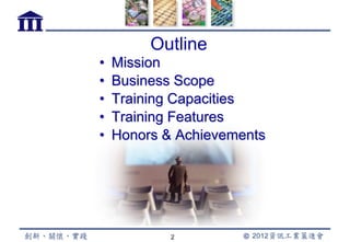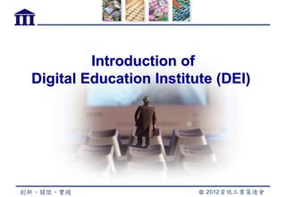 The document introduces the Digital Education Institute (DEI), which provides IT training and manpower development. It outlines DEI's mission to provide government and industry training, lists its business scope such as e-learning and certification programs, and details its training capacities, features, and honors. DEI has trained over 400,000 IT professionals over 30 years and its trainees come from various industries.