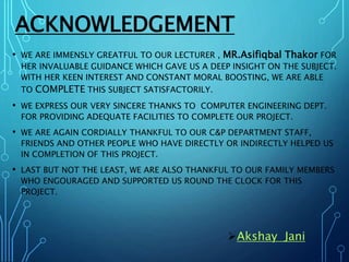 The document is a project acknowledgment by Akshay Jani for a seminar on digital electronics, specifically focusing on registers and counters. It expresses gratitude to Mr. Asifiqbal Thakor for guidance, the Computer Engineering Department for resources, and several individuals for their support. The document also includes a certificate of completion from the lecturer for the seminar work done as part of the engineering curriculum.