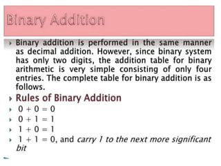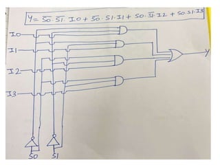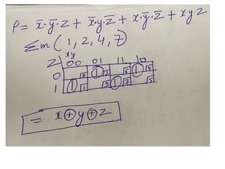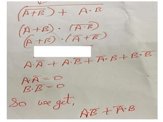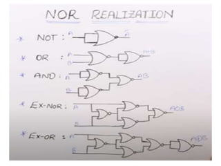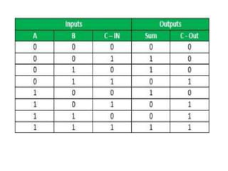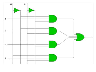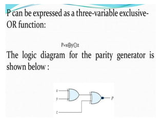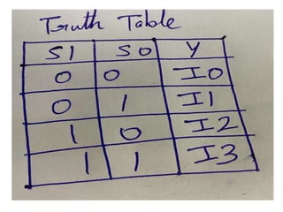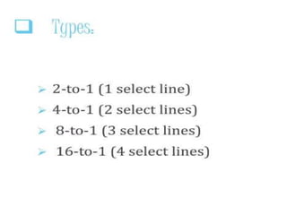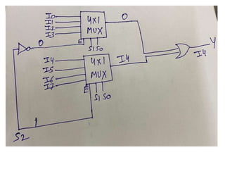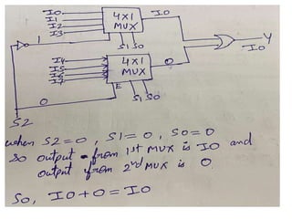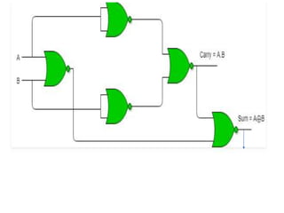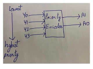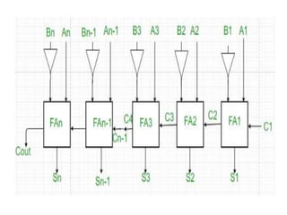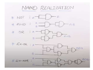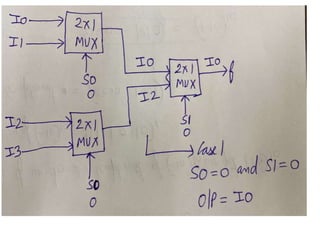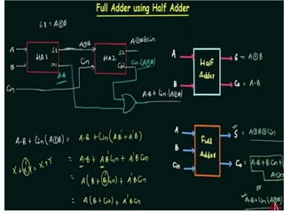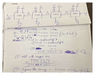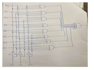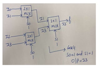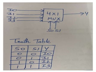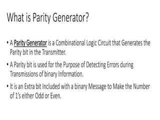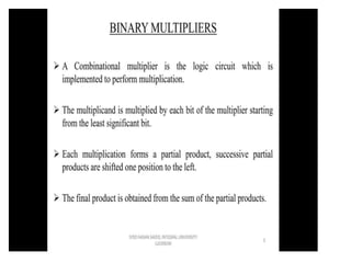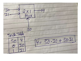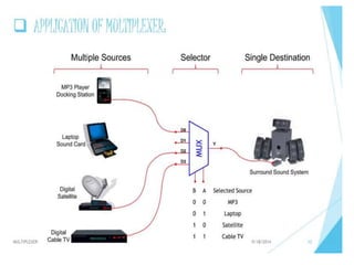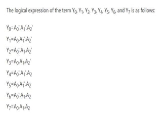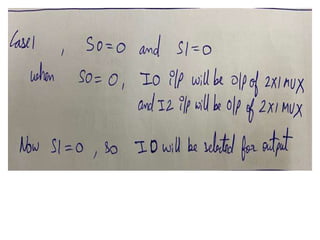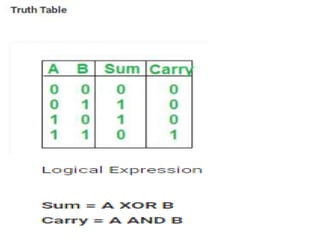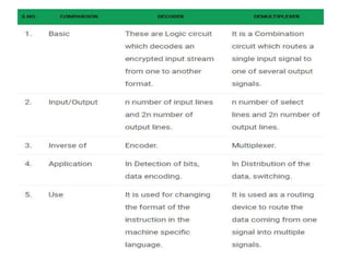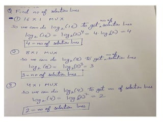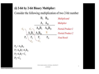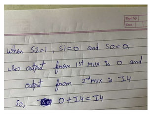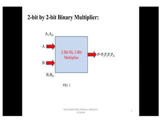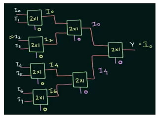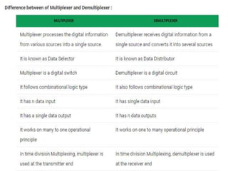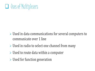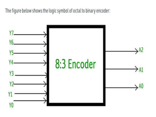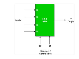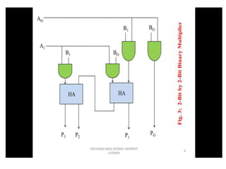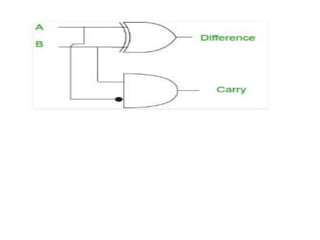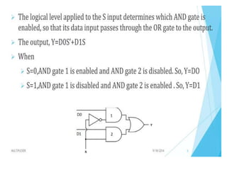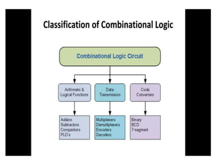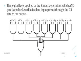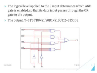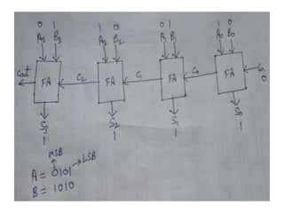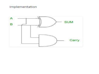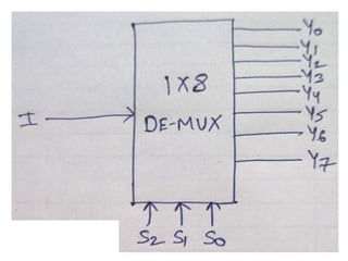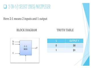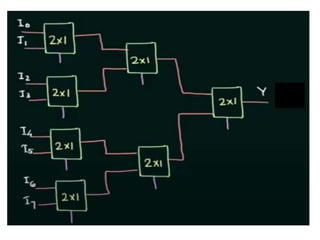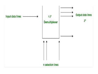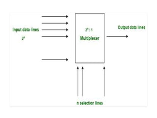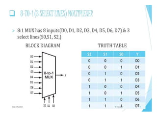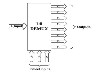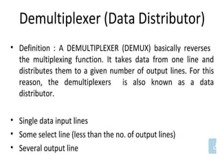 The document discusses various digital logic circuits including half adders, full adders, parallel adders, subtractors, multiplexers, demultiplexers, encoders, and decoders. It explains the basic concepts and provides examples of implementing 1-bit, 2-bit, 4-bit, and 8-bit versions of these circuits using logic gates like AND, OR, and NOT. Implementation of higher order multiplexers and decoders using lower order building blocks is also covered.