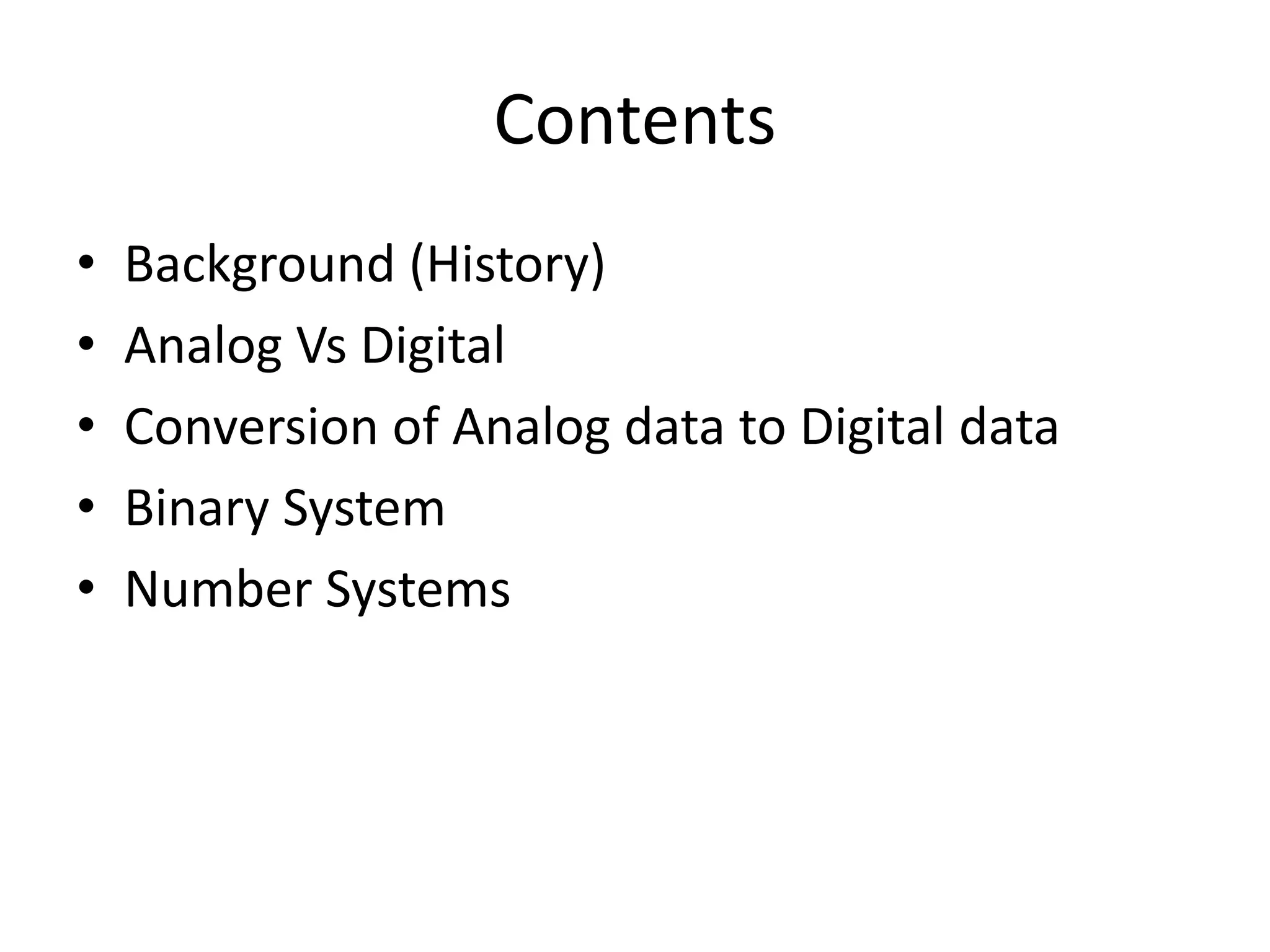 - An explanation of analog vs. digital signals and circuits, noting that digital circuits use discrete values represented by binary numbers.