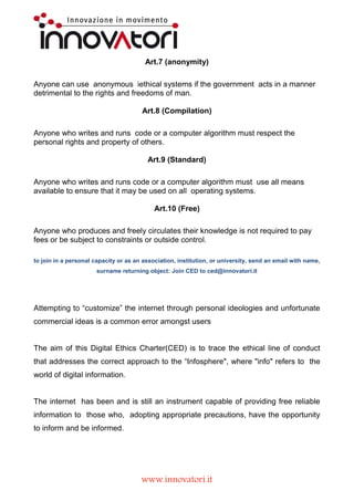 The document is a Digital Ethics Charter consisting of 10 articles that outline ethical guidelines for using the internet and digital technologies. The charter promotes universal access to the internet for free expression, encourages governments to develop local internet access and transparency in citizen-government relations, and requires respecting the internet as a shared resource and verifying information sources. It also addresses anonymity, open-source coding, and freely sharing knowledge without fees or constraints. The overall aim is to establish ethical conduct for all "information entities" in the digital world.