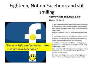 The document discusses digital etiquette and appropriate online behavior, especially for students. It notes that while social media has become very popular, some young people choose not to participate. The document emphasizes teaching digital citizenship and promoting netiquette through awareness of how technology use affects others and following etiquette guidelines. Teachers can help guide students to responsible and respectful use of technology.