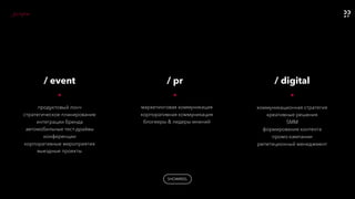 Eventum Premo – маркетинговое агентство, специализирующееся на интеграции offline и online решений в event, PR и digital. Агентство реализует проекты с высокой вовлеченностью, включая генерацию уникальных пожеланий и тесты на рождественские традиции, с охватом до 78 миллионов пользователей. Также разработаны и проводятся конкурсы и онлайн-игры для различных брендов, демонстрируя креативный подход и успешные результаты.