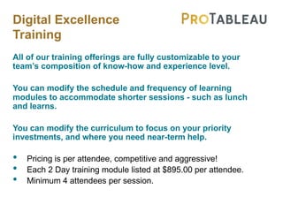 This document outlines customizable digital marketing training offerings, including courses on digital marketing strategy, Google marketing essentials, and content marketing. Each course is designed for various audiences, focusing on practical skills like website usability, SEO, and content strategy, with a fixed pricing model of $895 per attendee. It also profiles key instructors and their expertise in programmatic and digital marketing.