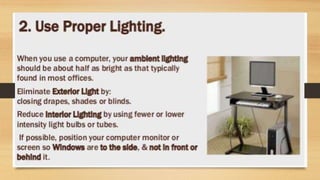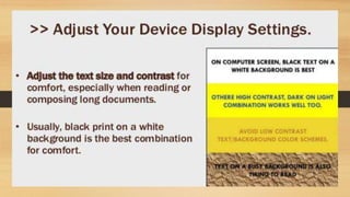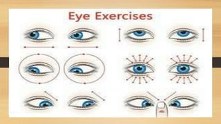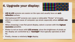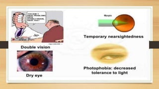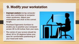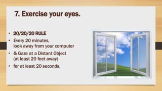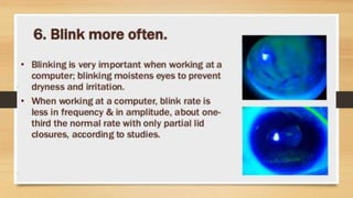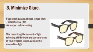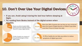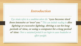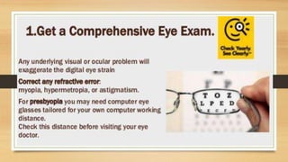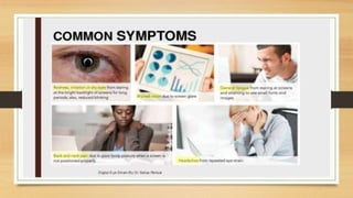 Digital eye strain describes eye and vision problems from prolonged use of digital devices like computers, tablets, e-readers and phones. It causes eye discomfort and vision issues. Factors contributing to digital eye strain include focusing on a single task for long periods, poor lighting, poor posture, not blinking enough, holding devices too close, and exposure to blue light from screens. Potential complications include problems with the retina, cataracts, age-related macular degeneration, and sleep disturbances. Treatment involves eye drops, artificial tears, blue light filtering glasses, anti-fatigue lenses, adjusting lighting, and wearing prescription glasses. Prevention focuses on taking regular breaks when using devices and following ergonomic guidelines.