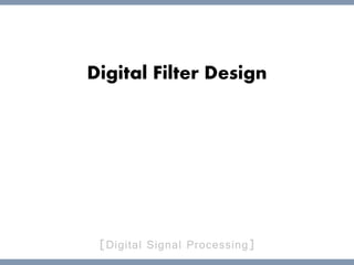 The document discusses digital filter design. It defines different types of filters, including high pass, low pass, band pass, and band stop filters. It also distinguishes between finite impulse response (FIR) filters and infinite impulse response (IIR) filters. FIR filters have a finite duration impulse response, while IIR filters may continue responding indefinitely. The document provides detailed explanations and examples of how each filter type works.