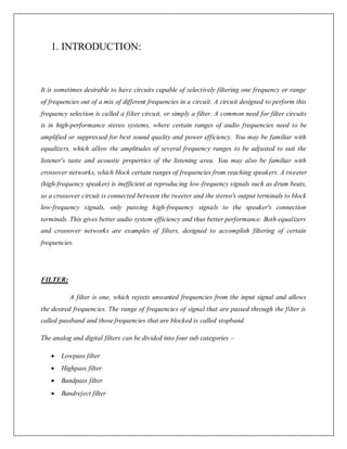 The document presents a report on digital filter design within the context of electrical engineering. It discusses various types of filters, including analog and digital filters, and elaborates on the design process for digital filters, particularly focusing on the implementation of IIR and FIR filters using different techniques such as windowing. Additionally, it highlights the advantages and disadvantages of FIR filters compared to IIR filters.