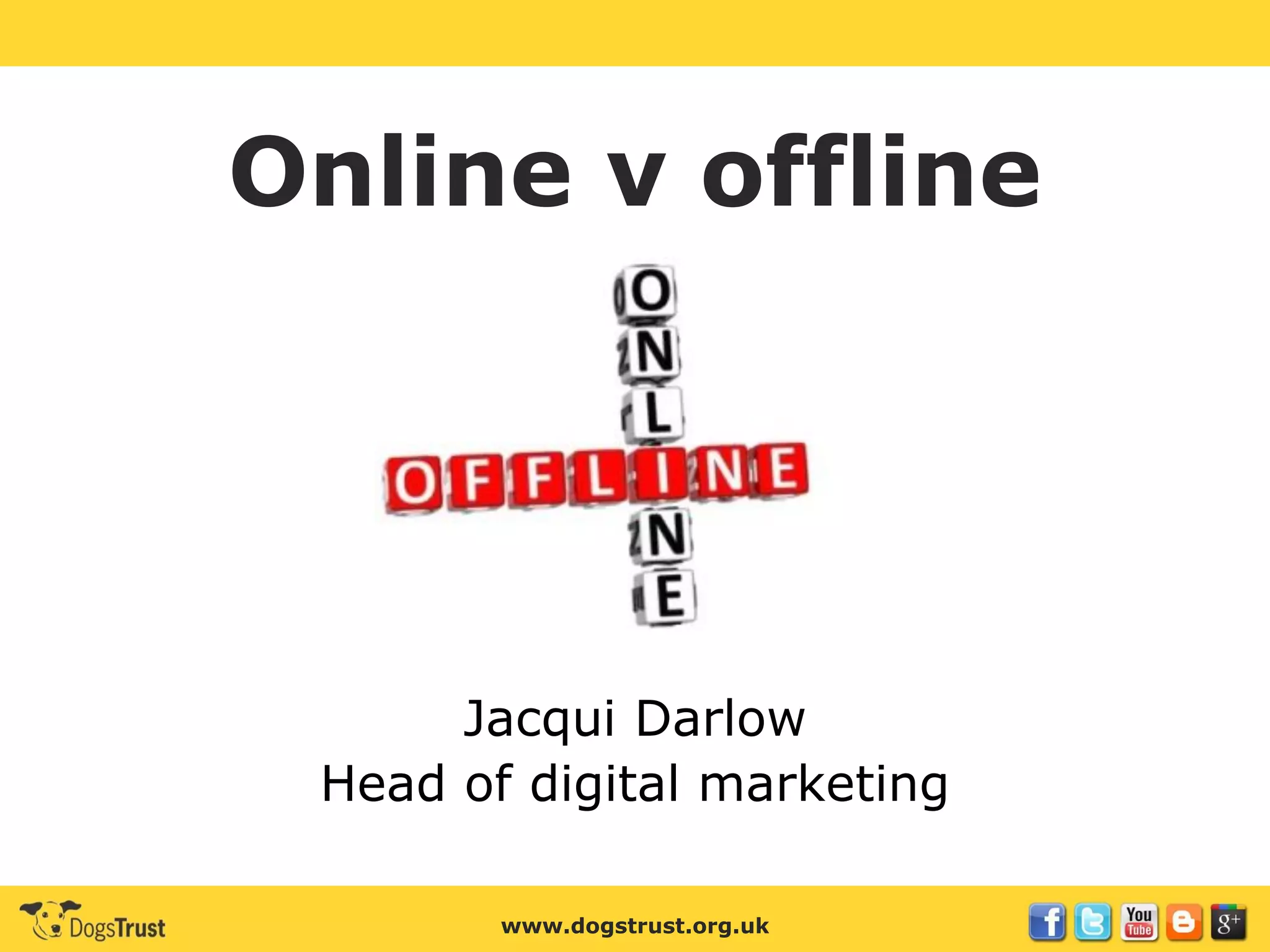 The document discusses the integration of online and offline marketing strategies at Dogs Trust, highlighting how both methods can complement each other for better audience engagement. It outlines the creative process behind enhancing their sponsorship product and the importance of maintaining offline communication for supporter retention, especially among varied age groups. Various testing methods and advertising formats across multiple platforms were explored to optimize outreach and fundraising efforts.