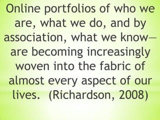 This document outlines 10 ways that Deborah Lyman plans to ensure that her digital footprint presents her in a positive, professional manner. She will create a professional blog and participate in discussions on existing blogs to showcase her skills and knowledge as an educator and technologist. She will use Facebook, Twitter, and resource sharing sites professionally to network with other educators and share resources. By using her real name, making her accounts public and searchable, and posting thoughtful, constructive content, she aims to develop a respected, credible online presence.
