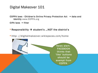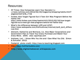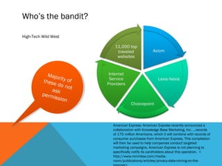 The document discusses digital footprints and online privacy, highlighting how personal data is collected and monetized through data mining by companies like Facebook and American Express. It raises concerns about the legality and ethics of data collection practices, including the use of deep packet inspection and targeted advertising. The text encourages individuals, particularly educators, to be aware of their digital footprint and its implications on personal reputation and privacy.