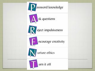 The document discusses digital footprints, which are the traceable online content attributed to individuals, notably affecting children and teenagers. It highlights the prevalence of online activities among youth, including research for school, social networking, and gaming, along with the necessity of parental awareness regarding online safety. Additionally, it mentions laws like COPPA and CIPA that aim to protect minors’ online information and restrict access to harmful content.