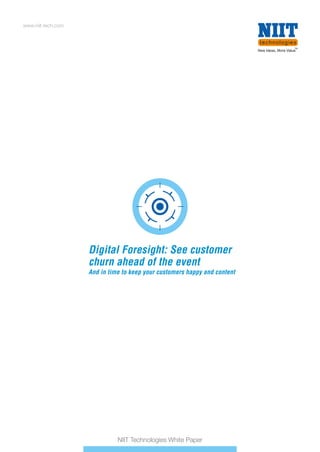 This document discusses NIIT Technologies' 'Digital Foresight,' a predictive analytics solution designed to anticipate customer churn and enable proactive engagement to retain high-value customers. It combines internal customer data with external information and advanced data science techniques to provide actionable insights and understanding of customer behavior and potential defections. The solution aims to improve customer relations by accurately identifying high-value customers and their changing needs through real-time analysis.