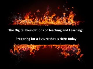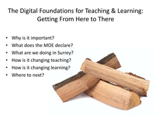 This document discusses how technology is transforming education in Surrey, British Columbia. It outlines BC's education plan to improve access to digital tools to prepare students for an increasingly digital world. Surrey is working to shift from print to digital resources, transform pedagogy and teaching, and personalize learning through initiatives like social studies e-texts, digital champions, and innovative learning designs. The goal is to ignite a fire for learning by engaging students and providing professional development opportunities for teachers on integrating technology.