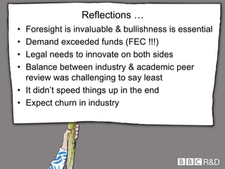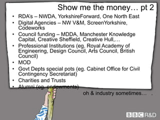 The document discusses the integration of knowledge networks in creative industries, emphasizing the importance of iterative research and user engagement. It outlines eight steps for enhancing collaboration and highlights various outputs related to social learning and digital content. Additionally, it addresses funding sources and the need for innovative frameworks to support emerging opportunities in the digital economy.