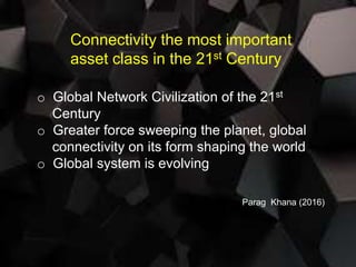 1. Global connectivity through digital infrastructure is transforming governments and the world system. Vast new infrastructure networks are being built for roads, railways, internet cables, and more.
