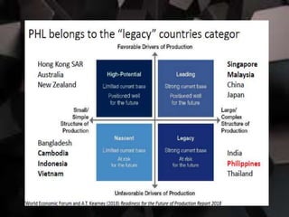 3. Countries like the Philippines face challenges in developing digital governance and readiness for future technologies. While e-government initiatives have improved rankings, businesses still lag in fully implementing digital transformation strategies. Urgent efforts are needed to
