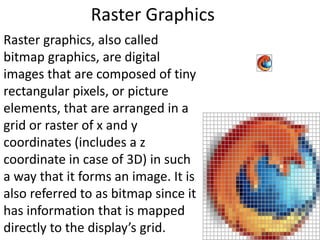 This document discusses different types of digital graphics file formats including raster graphics, vector graphics, and various file format types. Raster graphics are composed of pixels arranged in a grid, while vector graphics are created using shapes that can be edited individually. Common raster graphic file formats discussed include JPEG, TIFF, GIF, and BMP, along with their uses and advantages/disadvantages. Vector graphic file formats covered are PSD, AI, FLA, and WMF. The document also summarizes compression, image capture methods, file optimization techniques, factors affecting file size, file naming conventions, and asset management through folders.