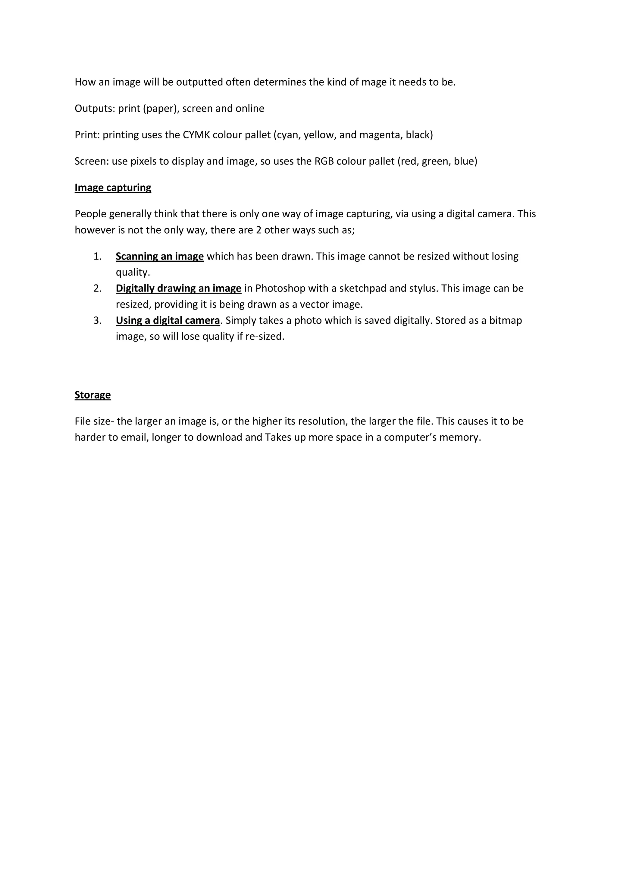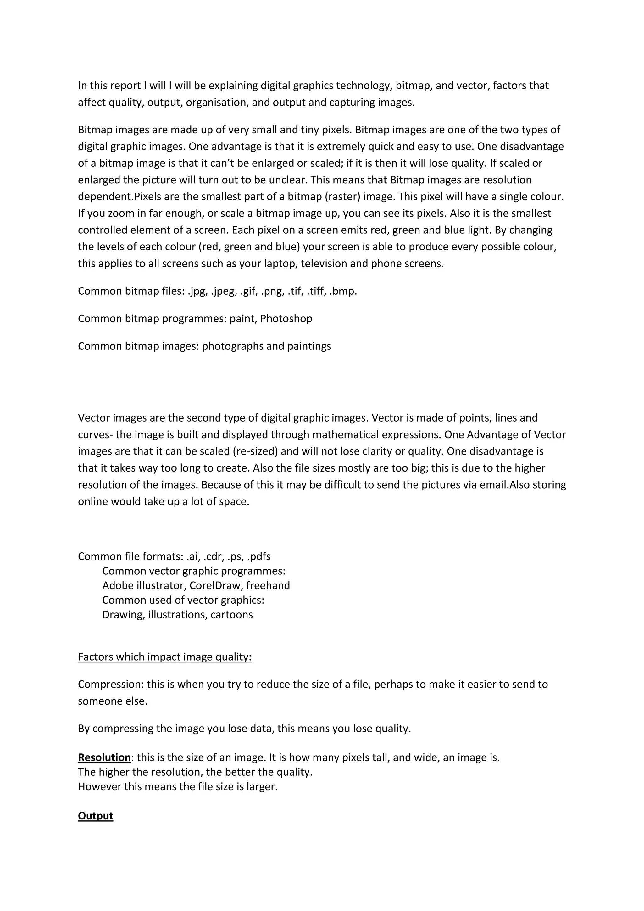 This document discusses different types of digital graphics, including bitmaps and vectors. Bitmaps are made up of pixels that represent single colors, so bitmap images lose quality when enlarged since individual pixels become visible. Vectors use mathematical expressions to build images from points, lines, and curves, allowing them to be scaled without loss of quality but resulting in larger file sizes. Factors like compression, resolution, and output method affect image quality, with higher resolutions producing better quality but larger files. Images can be captured through scanning, digital drawing, or cameras and stored as bitmaps or vectors.