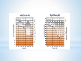 Digital hearing aids use computer technology to break sound into many bands to better amplify sound for a person's unique hearing loss pattern, offering superior sound quality over previous analog hearing aids. Digital hearing aids provide benefits like feedback cancellation, noise reduction, and speech enhancement through processing the sound with a microphone, amplifier, and receiver before sending it to the ear. The price of digital hearing aids varies depending on manufacturer, vendor, included services and features.
