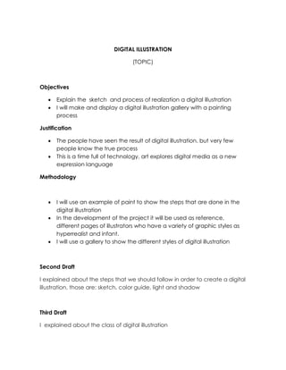 The document discusses the process of creating a digital illustration. It explains that the objectives are to explain the sketching and realization process of a digital illustration and to display a digital illustration gallery with the painting process. It outlines the typical steps in creating a digital illustration, which include sketching, creating a color guide, adding light and shadows. The document also classifies digital illustrations into four categories: scientific, literary, commercial, and editorial.
