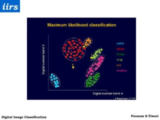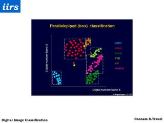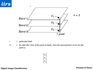 Digital image classification is the process of sorting pixels into categories based on their spectral values. There are supervised and unsupervised classification methods. Supervised classification involves using training sites of known categories to define statistical signatures for each class. Unsupervised classification groups pixels into clusters without prior class definitions. Validation is needed to assess classification accuracy by comparing results to ground truth data. Factors like training site selection and signature separability impact classification performance.