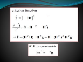 2) Inverse filtering which is a direct method that minimizes error between degraded and original images using matrix operations, but can be unstable due to noise or near-zero filter values.