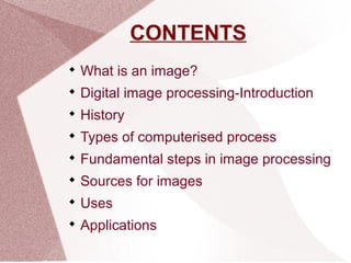 This document provides an overview of digital image processing. It discusses what digital images are composed of and how they are processed using computers. The key steps in digital image processing are described as image acquisition, enhancement, restoration, representation and description, and recognition. A variety of techniques can be used at each step like filtering, segmentation, morphological operations, and compression. The document also outlines common sources of digital images, such as from the electromagnetic spectrum, and applications like medical imaging, astronomy, security screening, and human-computer interfaces.