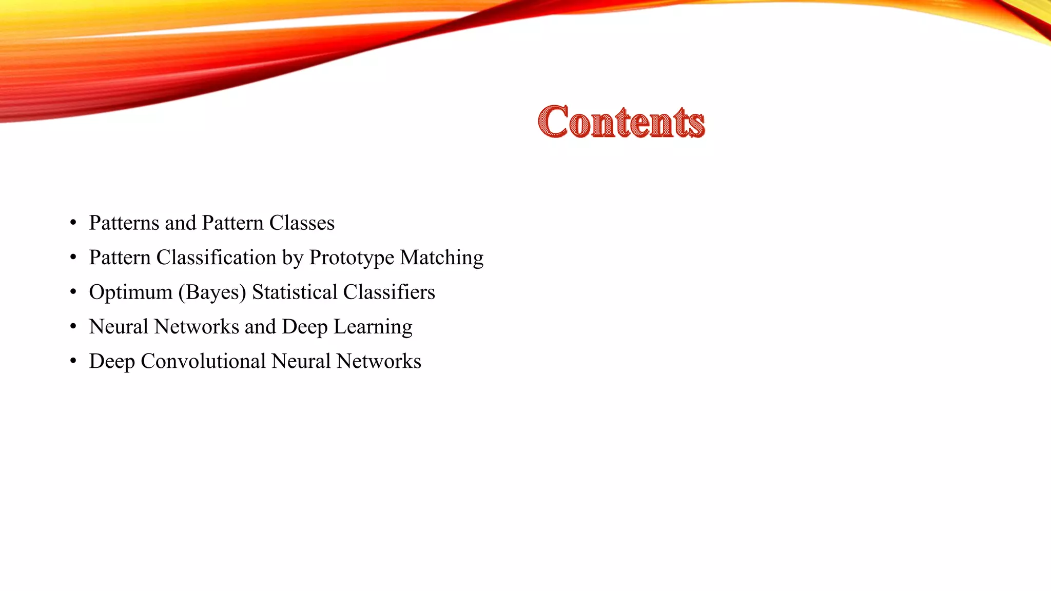 The document outlines various methods for pattern recognition, including statistical classifiers, neural networks, and decision-theoretic approaches. It emphasizes the importance of descriptor choice for class separability and discusses techniques for classifying patterns using metrics like Euclidean distance and normalized correlation. Additionally, it covers the principles of neural networks and deep learning, detailing how they learn to recognize patterns from data.