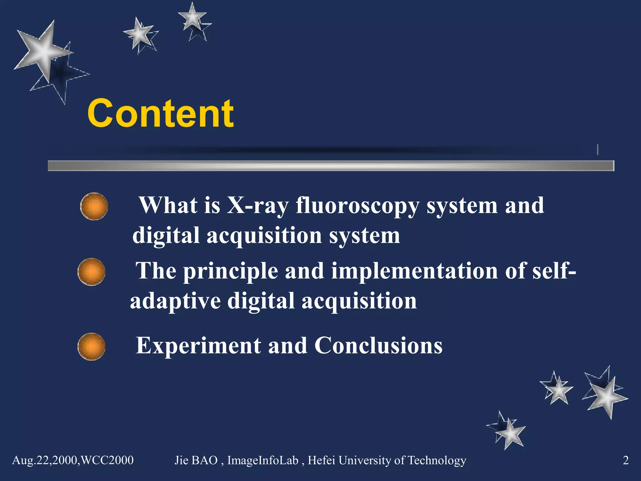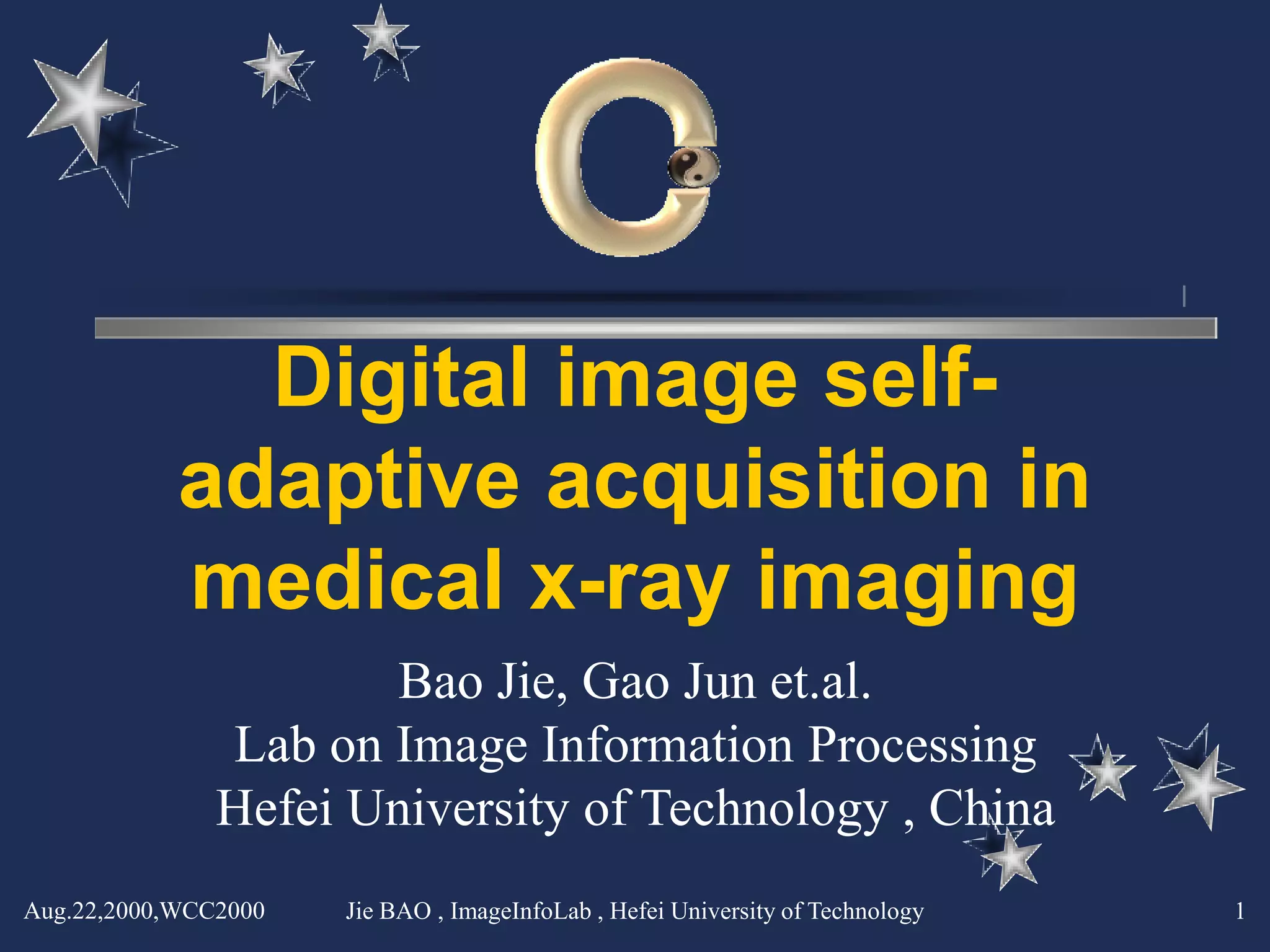 The document describes a method for digital self-adaptive image acquisition in medical x-ray imaging. It discusses x-ray fluoroscopy systems and the challenges of digital acquisition. The method uses digital subtraction to remove background signals, recognizes the valid imaging region, and analyzes the region's histogram to automatically set acquisition parameters like black level, white level, gain and offset for optimal image quality. An experiment validated that this approach improves image quality over traditional methods.