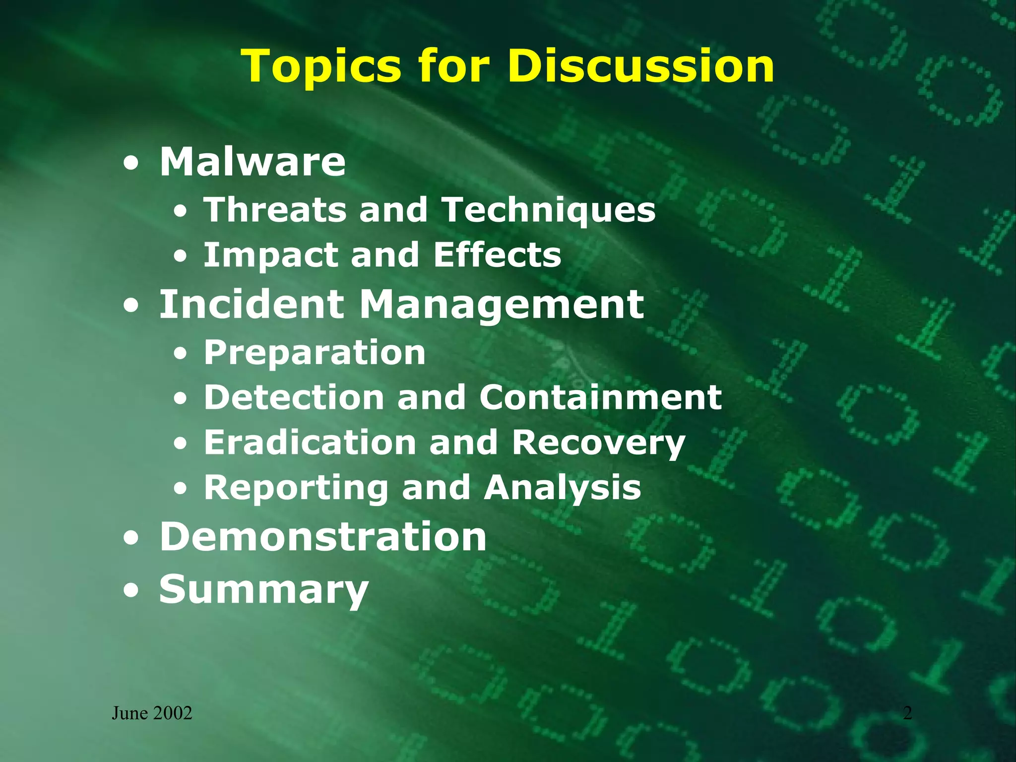 This document summarizes information about malware threats, including viruses, worms, Trojan horses, joke programs, hoaxes, and logic bombs. It discusses the types and examples of different malware, how they spread, their potential impacts, and an incident management model for preparation, detection, containment, eradication, recovery, and reporting of malware incidents. The summary concludes by stating that malware will continue to evolve and there is no single solution, requiring ongoing mitigation and management efforts.