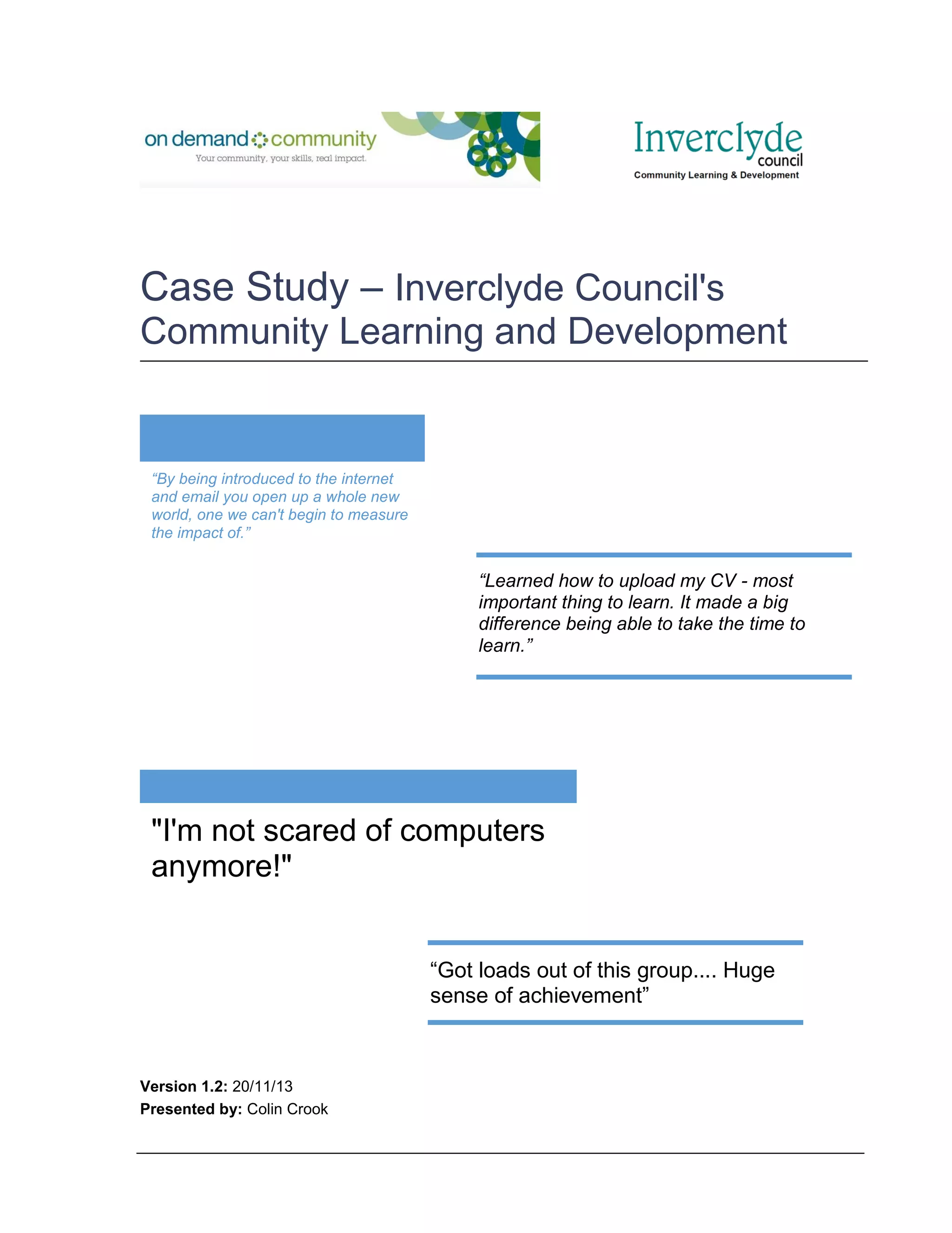 The Inverclyde Council's community learning and development initiative, in collaboration with IBM, aimed to improve digital skills and job application abilities for local residents facing technological barriers. The program provided hands-on training through five events, helping participants learn to navigate online job search tools and build their confidence in using computers. Feedback indicated significant positive impacts on participants' skills and self-esteem, as many learned to manage email accounts and apply for jobs independently.