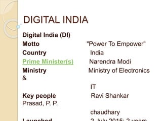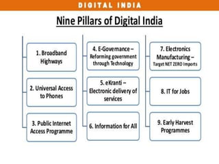 Digital India is a government initiative launched in 2015 to transform India into a digitally empowered society. It has three core components: creating digital infrastructure, delivering services digitally, and increasing digital literacy. The program aims to connect rural areas to high-speed internet, provide public access to the internet through villages and post offices, lay broadband networks along highways, and ensure mobile connectivity nationwide by 2018. It also focuses on e-governance, IT training, manufacturing electronics domestically, and developing BPO sectors in northeastern states. The initiative is led by the Ministry of Electronics and IT and partners with companies like Google, Microsoft, Qualcomm and Facebook.