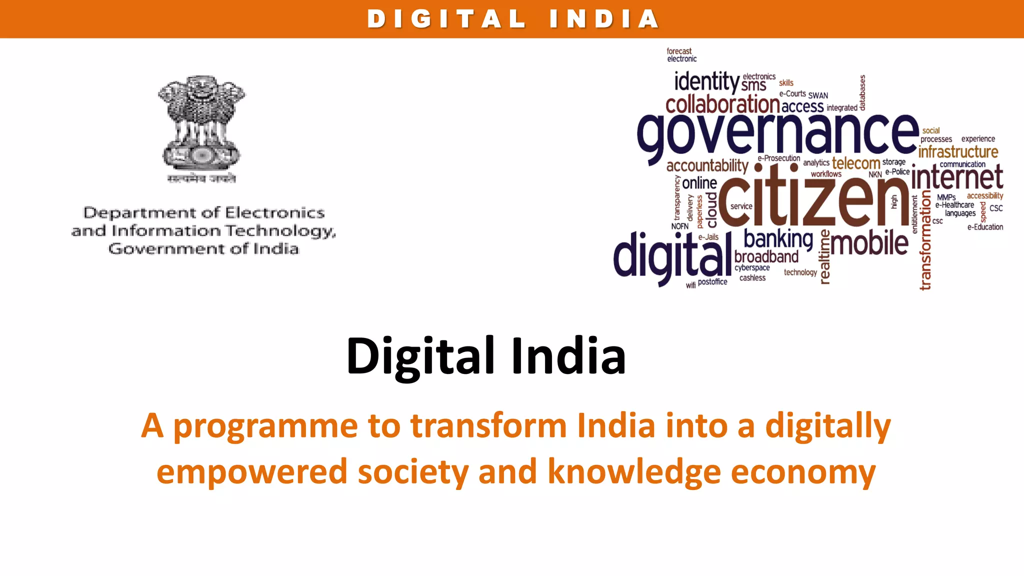 The Digital India program aims to transform India into a digitally empowered society and knowledge economy. It has 9 pillars that focus on areas like digital infrastructure, e-governance, digital literacy, and electronics manufacturing. The goals are to provide high-speed internet access nationwide, digitize government services, enhance online access to resources, and promote digital literacy. This will be achieved through initiatives to boost broadband connectivity, increase telecom and internet access, restructure existing e-governance programs, and develop skills for jobs in information technology. The program is coordinated across multiple government departments and ministries to realize this comprehensive digital transformation of India by 2022.
