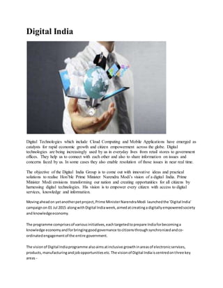 The Digital India program launched by Prime Minister Narendra Modi aims to transform India into a digitally empowered society and a knowledge economy through initiatives focused on digital infrastructure, governance on demand, and citizen empowerment. Key components include high-speed internet access, e-governance reforms, digital lockers for document storage, and various citizen engagement platforms. The program seeks to create inclusive growth in technology, promote innovation across sectors, and enhance service delivery to citizens while integrating government processes and improving accessibility.