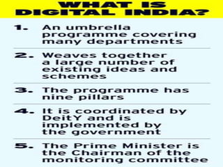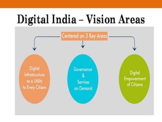 The document outlines the 'Digital India' initiative launched by the Indian government in 2015, highlighting its objectives, structure, and the nine pillars that support its framework. It discusses the opportunities, impacts, and challenges faced by the program, suggesting improvements for implementation and future growth. The initiative aims to empower citizens through technology, economic growth, and job creation while addressing concerns like infrastructure deficits and cybersecurity.