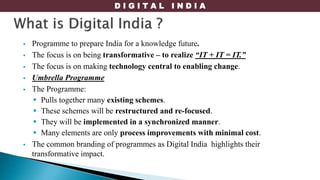 The Digital India programme aims to transform India into a digitally empowered society and knowledge economy. It focuses on infrastructure development and digital services/literacy. The key areas are: 1) Digital infrastructure as a core utility, 2) Governance and services on demand, and 3) Digital empowerment of citizens. The programme involves consolidating existing schemes and implementing them in a synchronized manner to maximize impact at minimal cost. The goal is an inclusive digital India with high-speed internet access for all and digital services/resources available to citizens.