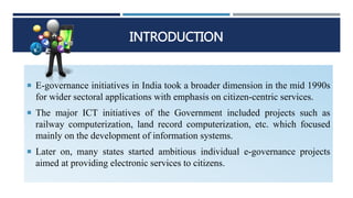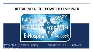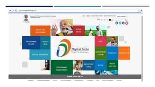 The document provides an overview of India's Digital India initiative. It discusses the vision and goals of Digital India, which are to transform India into a digitally empowered society and knowledge economy by focusing on digital infrastructure, governance and services, and digital empowerment of citizens. The key components include improving broadband internet access, digital identity programs, expanding access to services via common service centers, and improving digital literacy. The program management structure establishes oversight committees headed by the Prime Minister and Cabinet Secretary to monitor progress and resolve issues in implementing the various Digital India projects and initiatives across government departments.